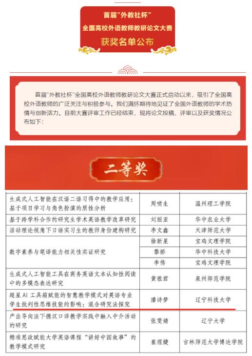 近日,首届“外教社杯”全国高校外语教师教研论文大赛获奖名单正式公布,辽宁科技大学外国语学院潘诗梦老师的论文《超星AI工具箱赋能的智慧教学模式对英语专业学生批判性思维技能的影响:混合研究法探究》从全国611篇投稿中脱颖而出,荣获全国二等奖。据悉,本次大赛辽宁省仅有4名教师获奖,潘诗梦的成果不仅是个人学术能力的体现,更彰显了我校外语教学研究在省内的突出实力。