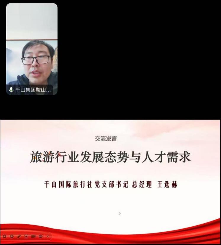 此次活动采用线上线下相结合的方式。活动中,学院教工经济系基础部党支部书记王丽梅同志阐述了联创共建活动的深远意义,她指出,联创共建活动能够增强党组织的凝聚力和战斗力,有效推动双方业务的协同发展,双方力争在产教融合、专业建设、人才培养等方面互联互享、共同提高,为旅游业的发展贡献力量。千山国际旅行社党支部书记王选赫同志介绍千山旅游集团及支部的基本情况,并做“旅游行业发展态势与人才需求”的主题发言。他指出,近年来,我国旅游业迎接挑战,把握机遇,旅游市场得以调整恢复。文旅深度融合促进行业呈现新面貌,科技助力旅游业实现转型升级,一系列新特点彰显旅游业的韧性与活力。在高质量发展背景下,旅游业亟须三大类人才,包括高水平科技型旅游人才、高质量复合型旅游人才、高素质创新型旅游人才。会上,双方就如何加强基层党组织建设、开展党建结对共建活动、实现资源共享等议题进行了深入交流和探讨。最后,集体重温入党誓词。